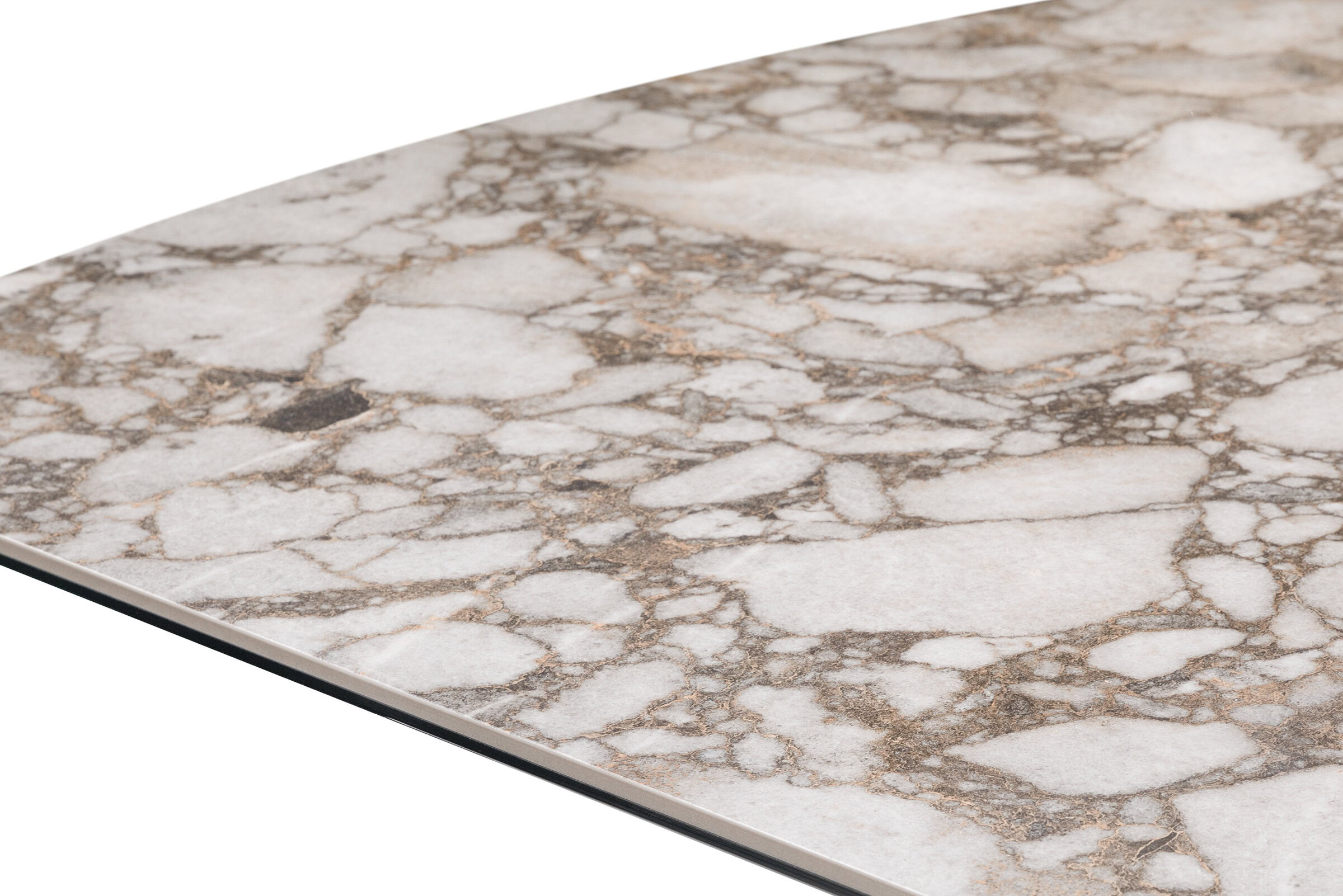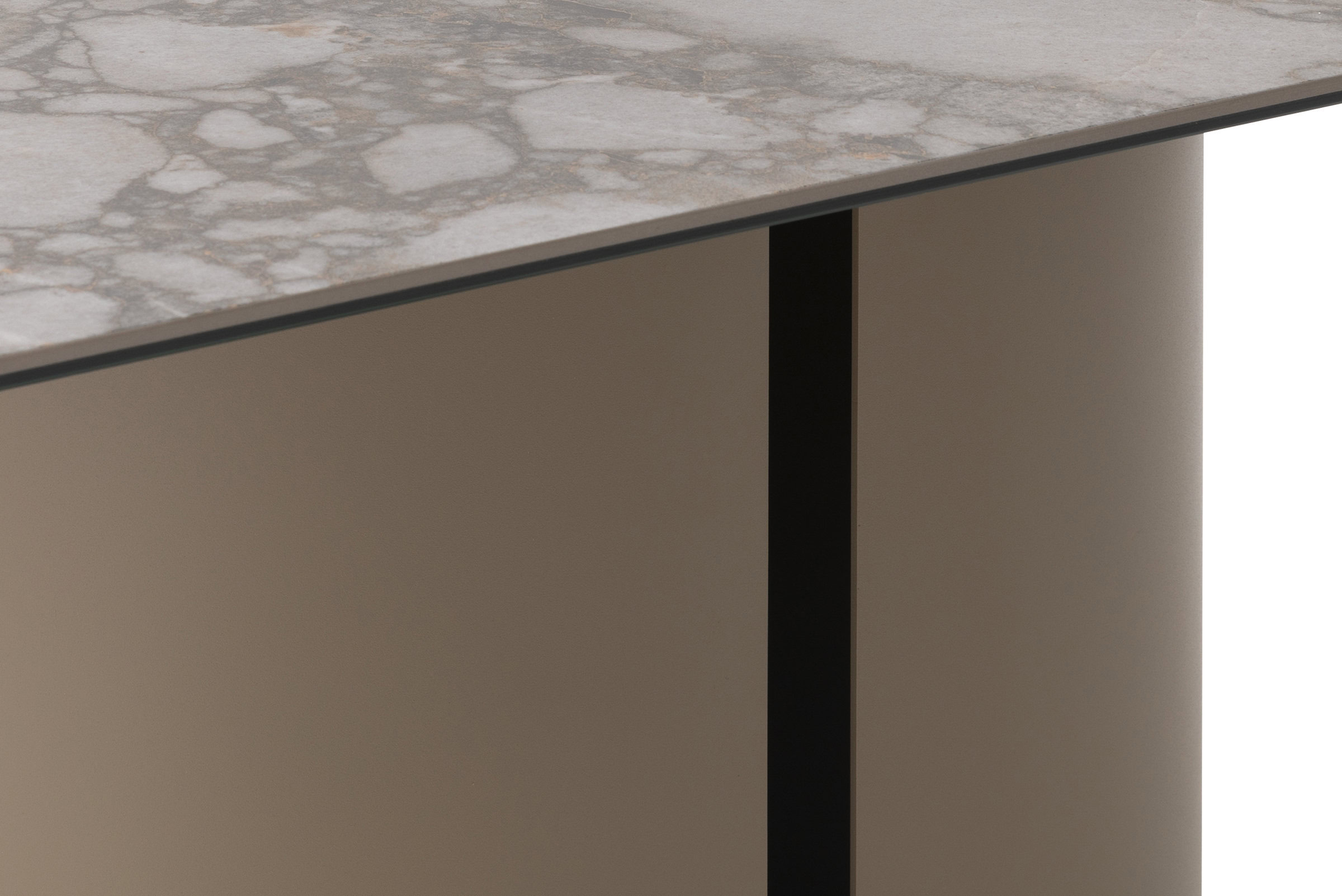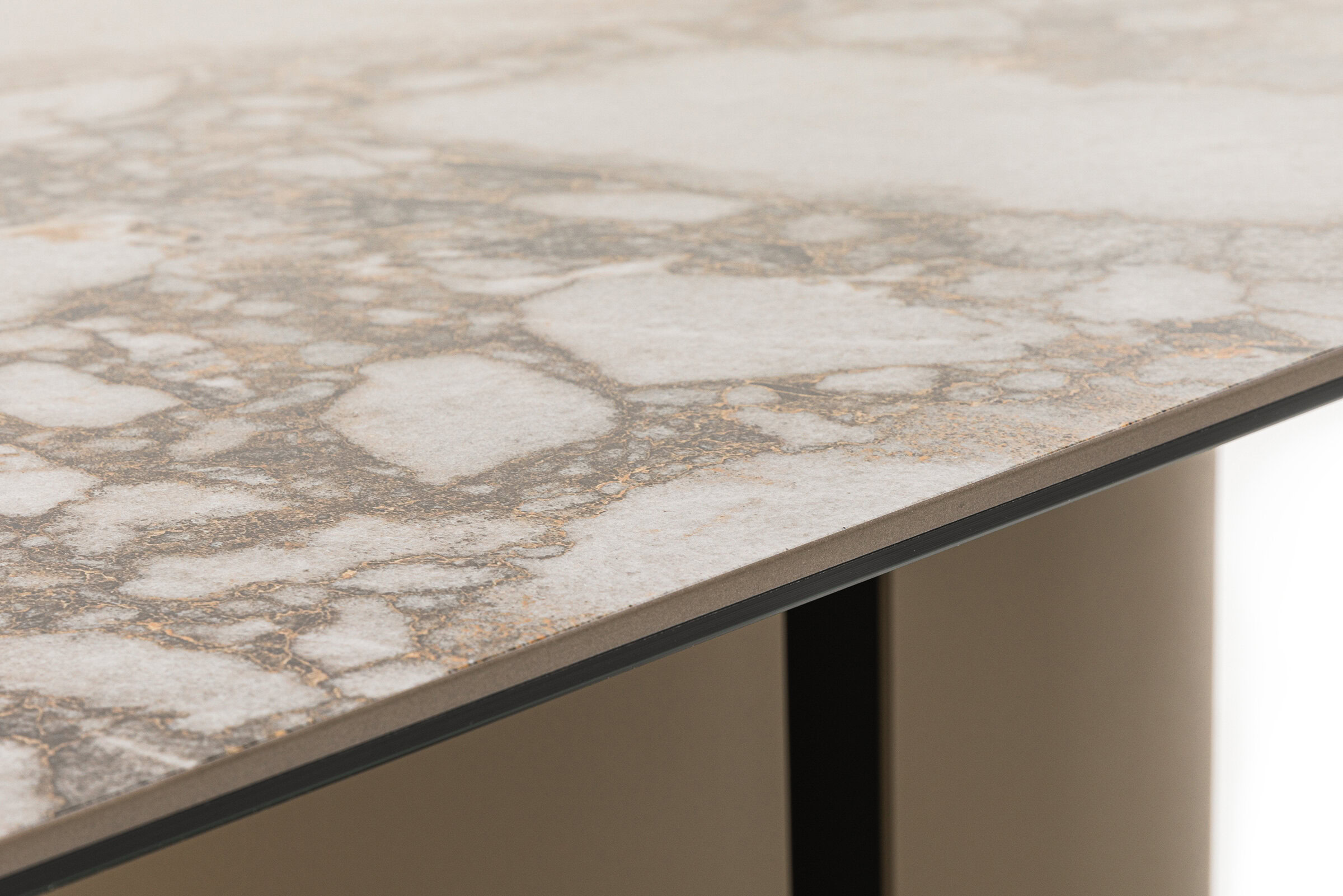 The Vinci Dining Table boasts a unique and beautiful neutral table top design, crafted from special Italian ceramic and tempered glass. Sa forme rectangulaire est complétée par des extrémités incurvées, ajoutant une touche de modernité à tout espace de repas. L'épais pied en métal, placé au milieu de la table, permet de s'asseoir largement tout autour, créant ainsi une atmosphère accueillante pour les réunions et les repas. La table est disponible dans un élégant neutral beige color, perfect for adding warmth and sophistication to your dining area.