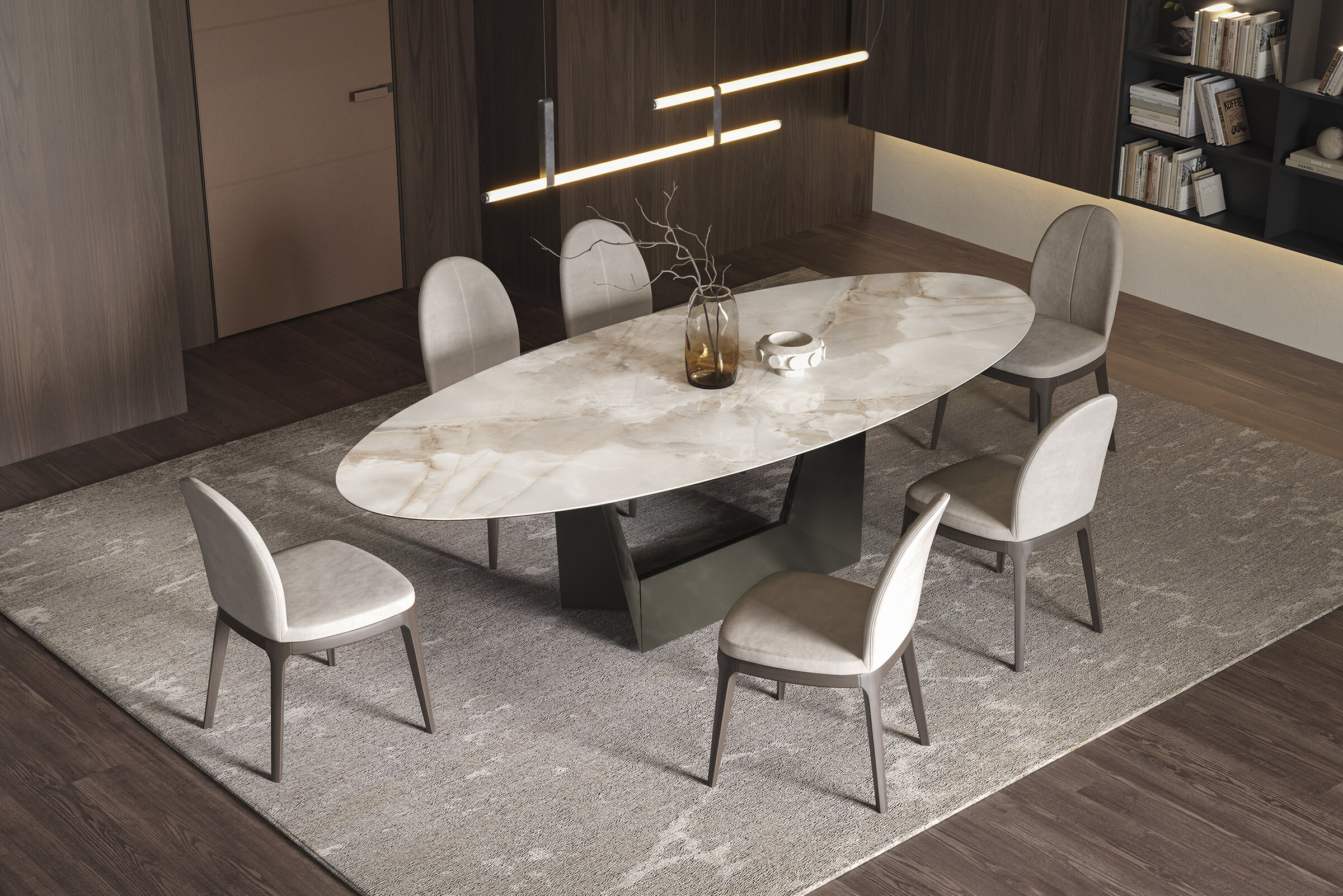 Embark on a journey through the Minera Series, where stone, ceramics, and glass intertwine to create furniture that transcends mere functionality. This oval shape dining table, an integral part of this narrative, brings a touch of earth’s history into your contemporary living space.