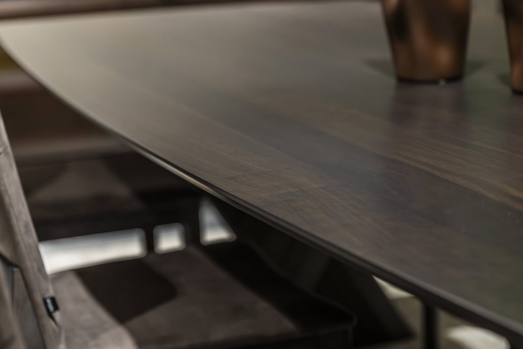 Immerse yourself in the beauty of contemporary design with the Cross Dining Table. The sleek and modern metal legs lend a touch of sophistication. The boat-shaped table top enhances the visual appeal and creates a harmonious balance between form and function.