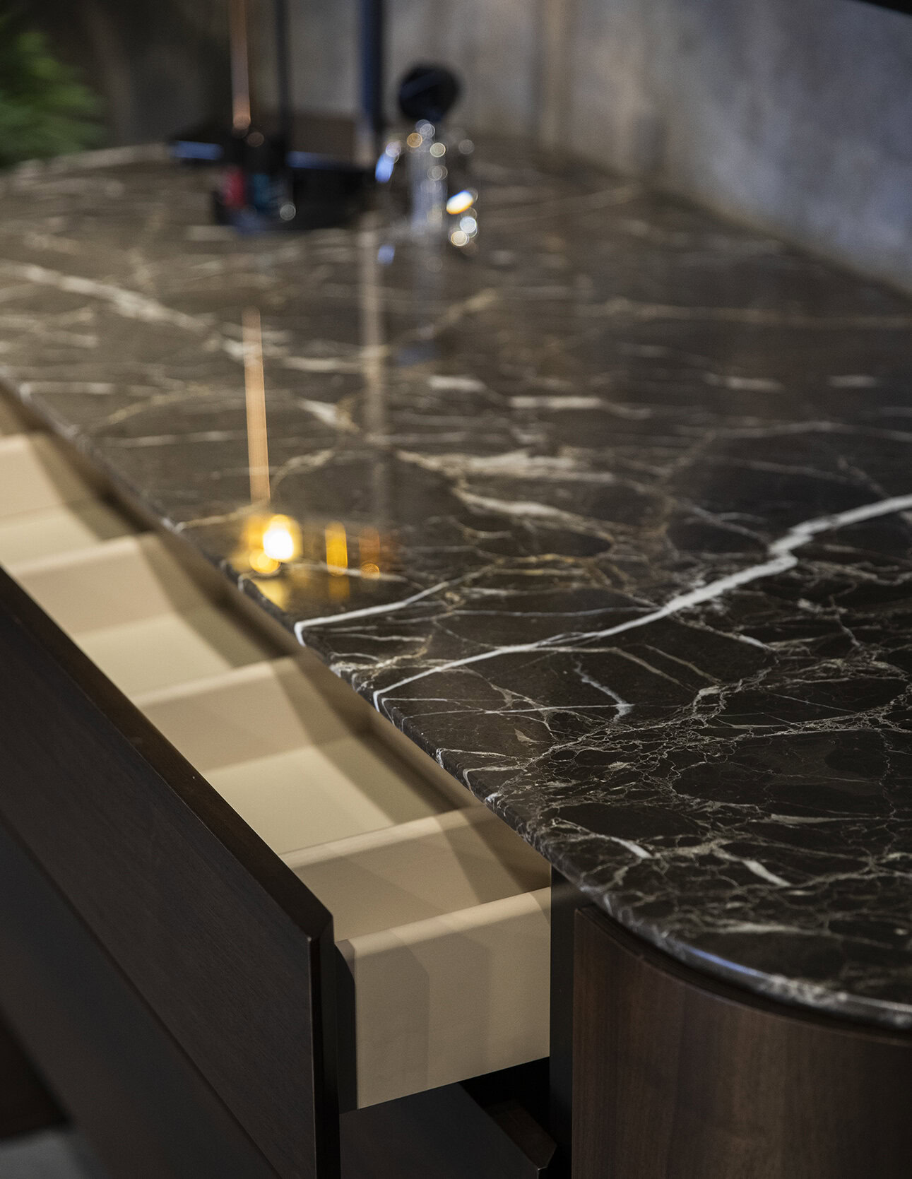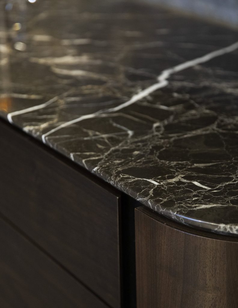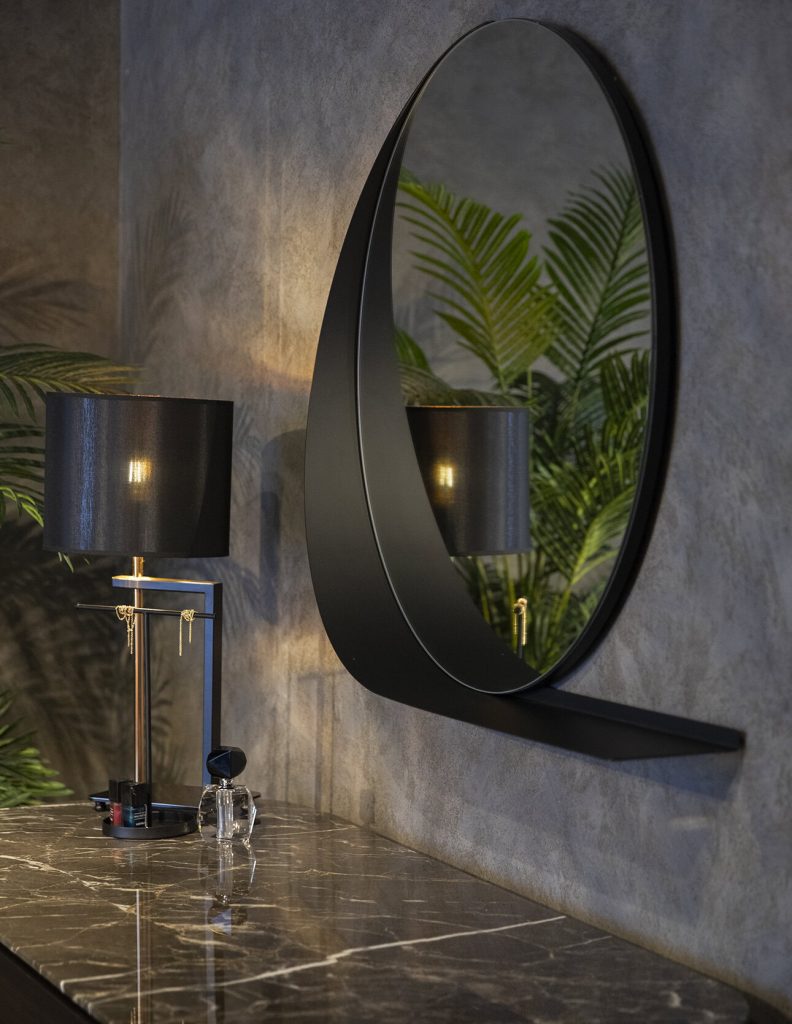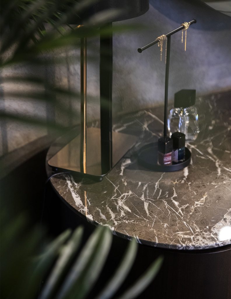 Incorporate Natural Elements: Introduce natural materials like wood and stone to add warmth and texture to the space, as seen with the Naya Dresser’s pill-shaped stone tabletop.