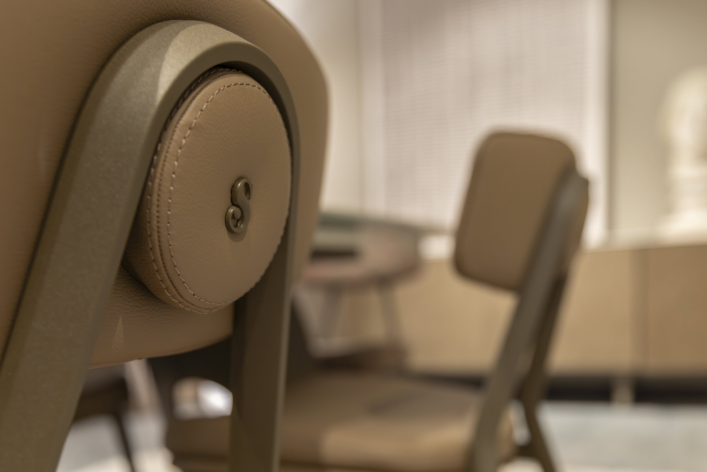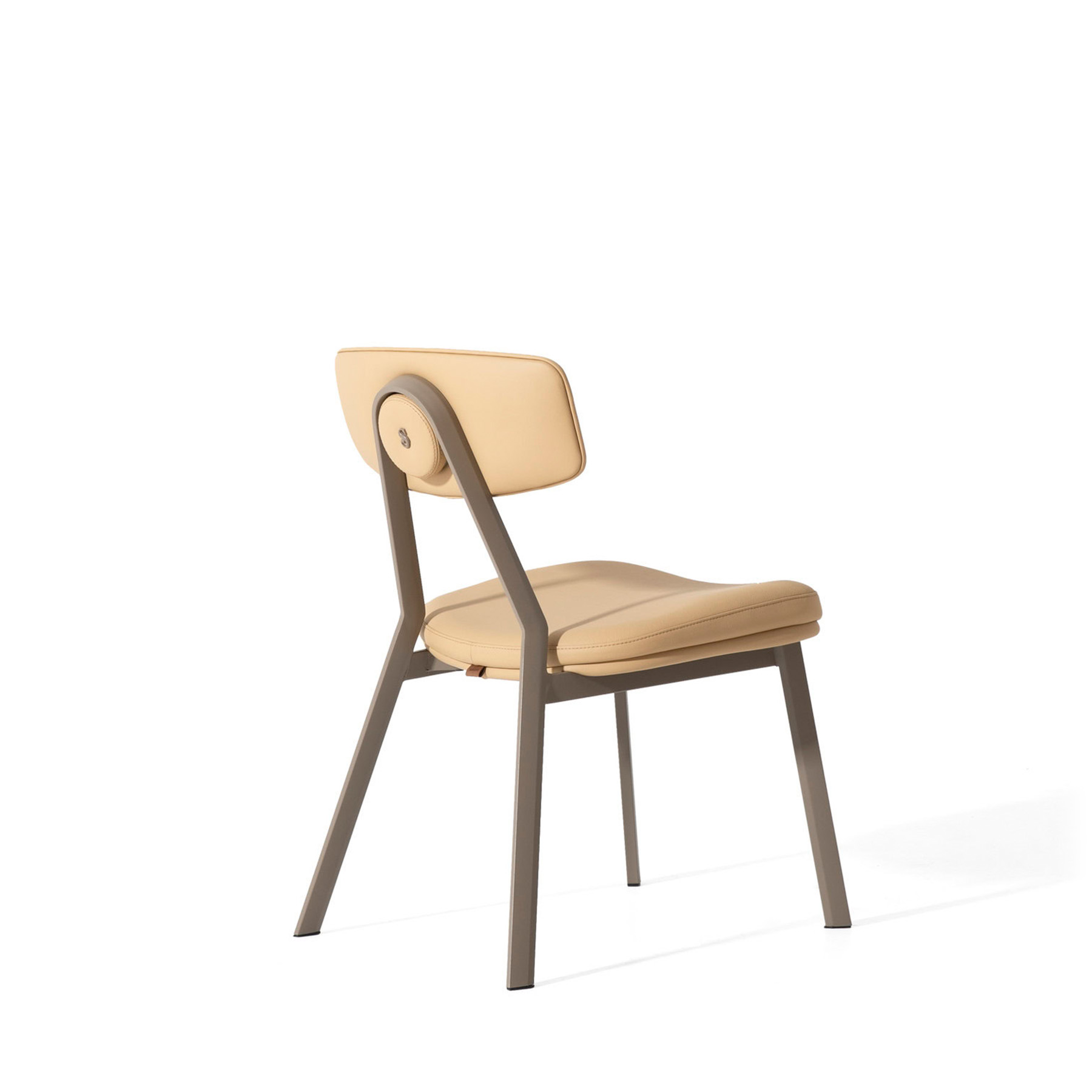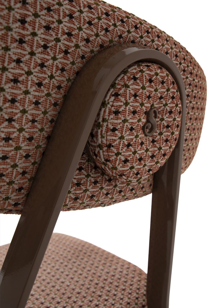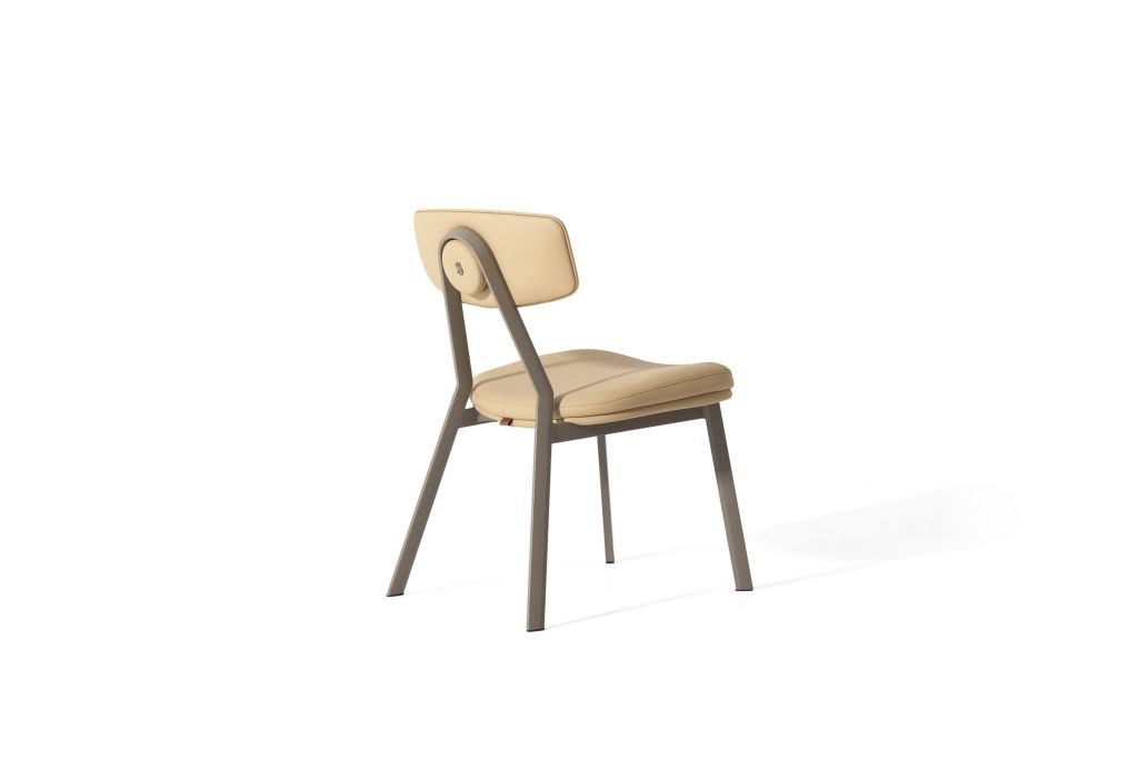 The seat and backrest are upholstered in premium leather available in a wide range of colors, offering a luxurious texture and refined appearance suited for high-end interiors. For additional customization, fabric upholstery is also available in many colors and textures exclusively in-store, providing interior designers and homeowners with extensive personalization possibilities. The combination of aluminum structure and premium upholstery ensures a perfect balance between comfort, durability, and contemporary elegance.
